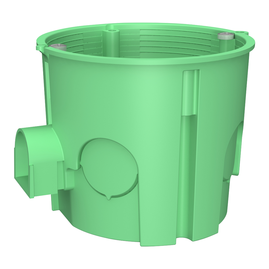 Коробка інсталяційна (монтажна) PLANK MB003 глибока 65х60 мм — це вдосконалений елемент електрофурнітури для прихованого монтажу в суцільних стінах (бетон, цегла, піноблок), який вирізняється збільшеним внутрішнім об'ємом. Завдяки глибині 60 мм, цей підрозетник дозволяє не лише встановити механізм розетки чи вимикача, але й зручно розмістити додаткові елементи, такі як реле розумного будинку, блоки керування освітленням або велику кількість проводів і клем, що часто неможливо у стандартних коробках глибиною 45 мм. Виріб виготовлено з високоякісного поліпропілену зеленого кольору, який має підвищену термостійкість до 850°C, не підтримує горіння та не містить шкідливих речовин, що підтверджує його безпеку та надійність. Модульна конструкція дозволяє легко з’єднувати коробки між собою в блоки (по 2, 3, 4, 5 і більше постів), автоматично зберігаючи стандартну міжосьову відстань 71 мм, що значно спрощує процес монтажу та гарантує ідеальну геометрію блоку електрофурнітури. У комплекті постачається спеціальний шуруп для фіксації механізмів, а на корпусі передбачені чіткі місця для введення кабелю, які легко виламуються в потрібному напрямку.