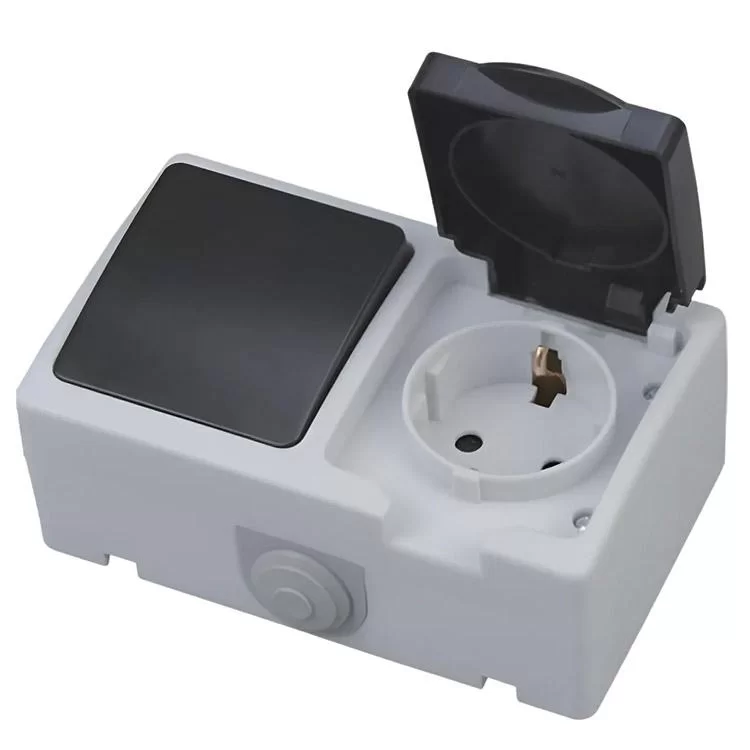 Корпус виконано з міцного пластику сірого кольору, стійкого до механічних пошкоджень та ультрафіолету, а кришка розетки та клавіша вимикача зазвичай мають контрастний чорний або темно-сірий колір, що робить виріб менш марким. Завдяки ступеню захисту IP54, конструкція надійно захищена від потрапляння пилу та бризок води з будь-якого напрямку, що дозволяє безпечно використовувати блок у вологих або запилених умовах. Розетка оснащена заземлюючими контактами для підвищення електробезпеки та підпружиненою кришкою, яка автоматично закриває гніздо, коли воно не використовується.