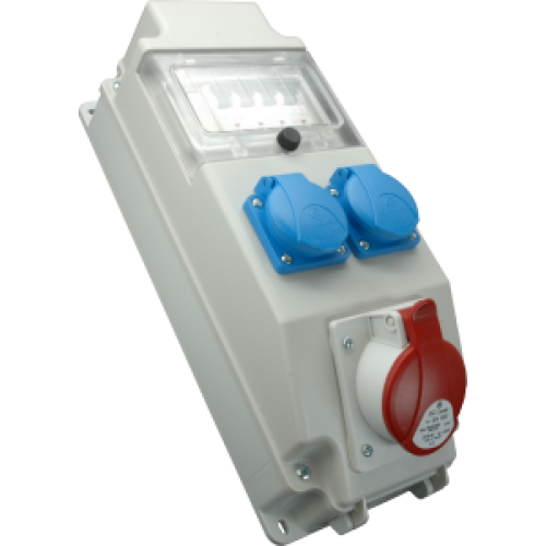 Розеточна частина складається з двох однофазних розеток VZ16S на 16 А (250 В, 2P+PE) для підключення звичайних побутових або професійних інструментів та однієї силової розетки IERN 3232 на 32 А (250 В, 2P+PE), яка дозволяє живити більш потужне однофазне обладнання. Корпус виготовлений з міцного ударостійкого пластику, розрахований на настінний вертикальний монтаж і має ступінь захисту IP44, що гарантує захист від бризок води та пилу, дозволяючи використання щита як усередині приміщень, так і на вулиці під накриттям.